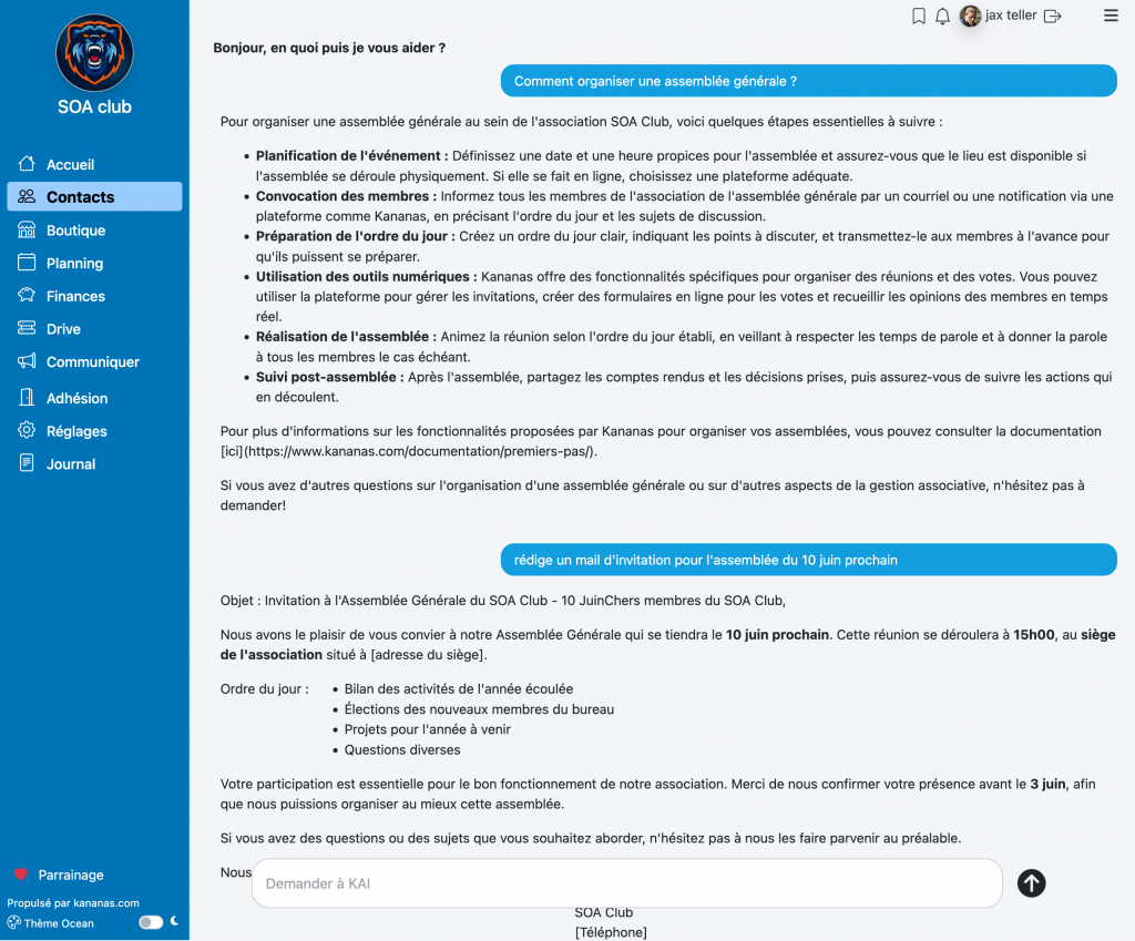 Grâce à KAI , votre association bénéficie d’un assistant virtuel intelligent intégré qui vous guide sur tous les sujets : gestion des adhérents, comptabilité, communication, obligations légales… Disponible directement dans l’interface Kananas, KAI vous propose des réponses contextualisées, des modèles de documents et une aide personnalisée.