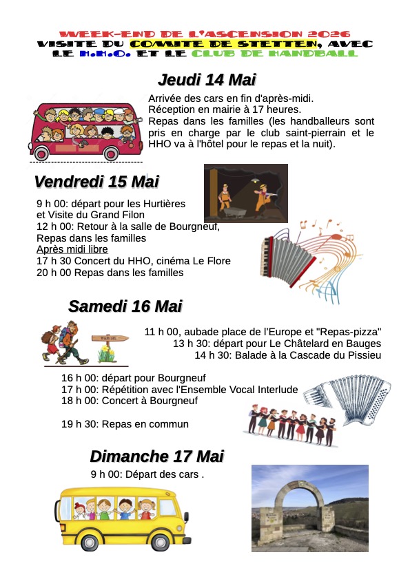 Réservez votre week-end de l’Ascension pour rencontrer nos amis de Stetten…! En effet, une délégation du Comité de Jumelage allemand nous rendra visite, accompagnée des jeunes handballeurs et de l’orchestre du HHO Stetten eV. (Handharmonika Orchestre Stetten eV), le formidable orchestre d’accordéons. Au programme aubades et concerts, à Saint Pierre d’Albigny et à Bourgneuf, ouverts à tou(te)s. N’hésitez pas à venir profiter de ce moment festif et à faire ainsi, connaissance avec le Comité de Jumelage.