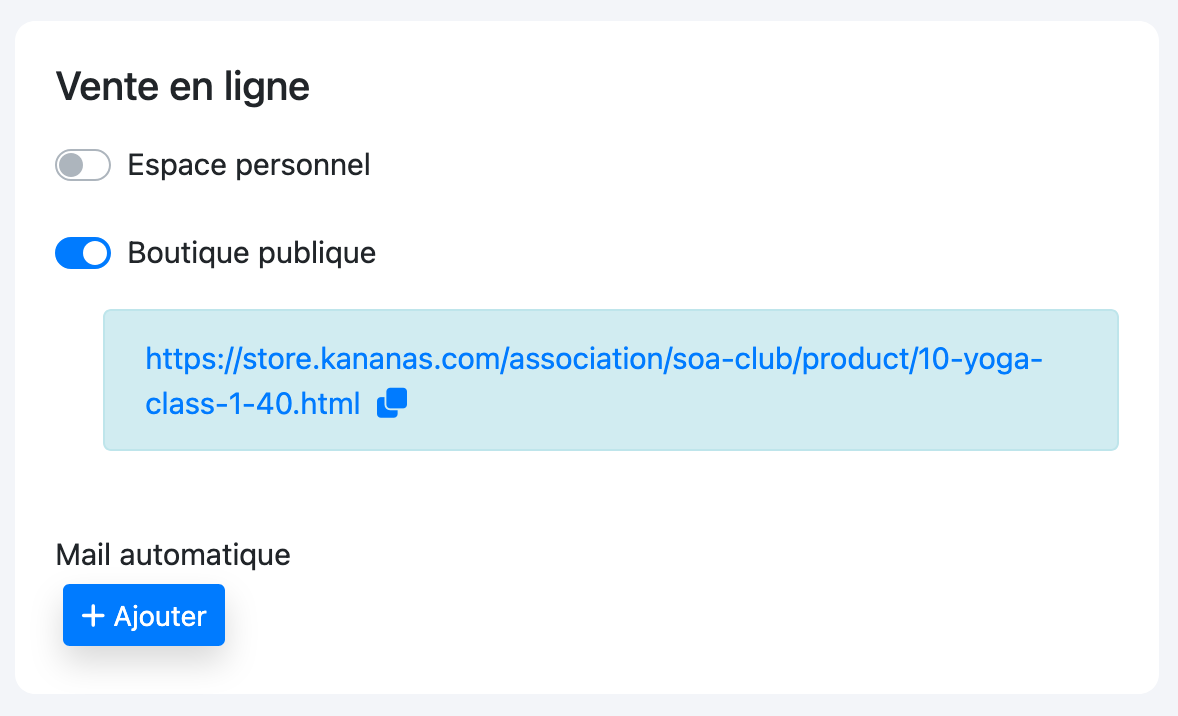 Si vous voulez que le produit apparaisse dans votre boutique publique, accessible à tous, il faut cocher Boutique publique. Vous pourrez alors envoyer le lien d’achat par mail ou le mettre sur votre site web.